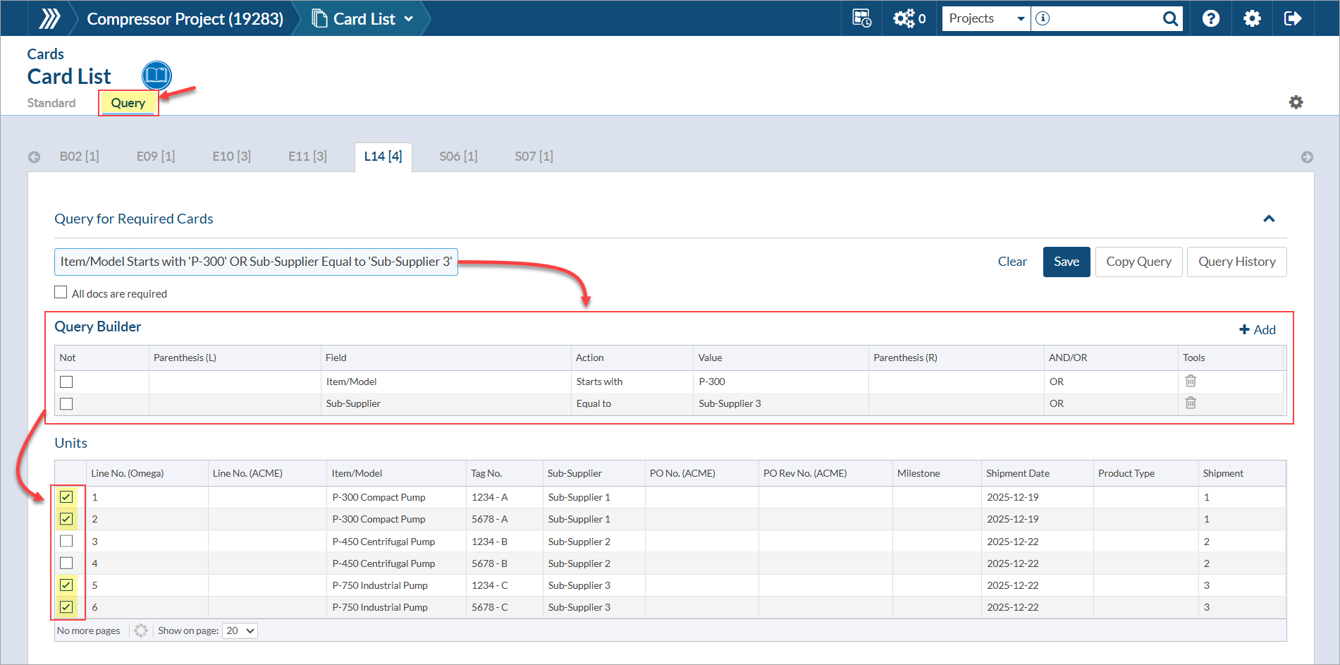 The query tab enables users to define the criteria between required and not required cards automatically using a query.