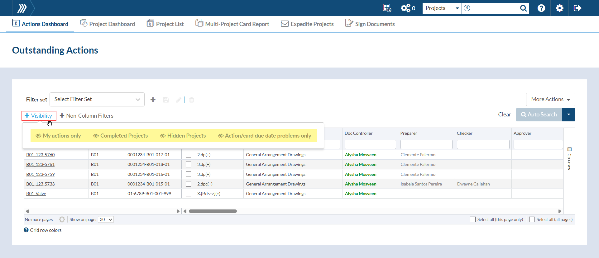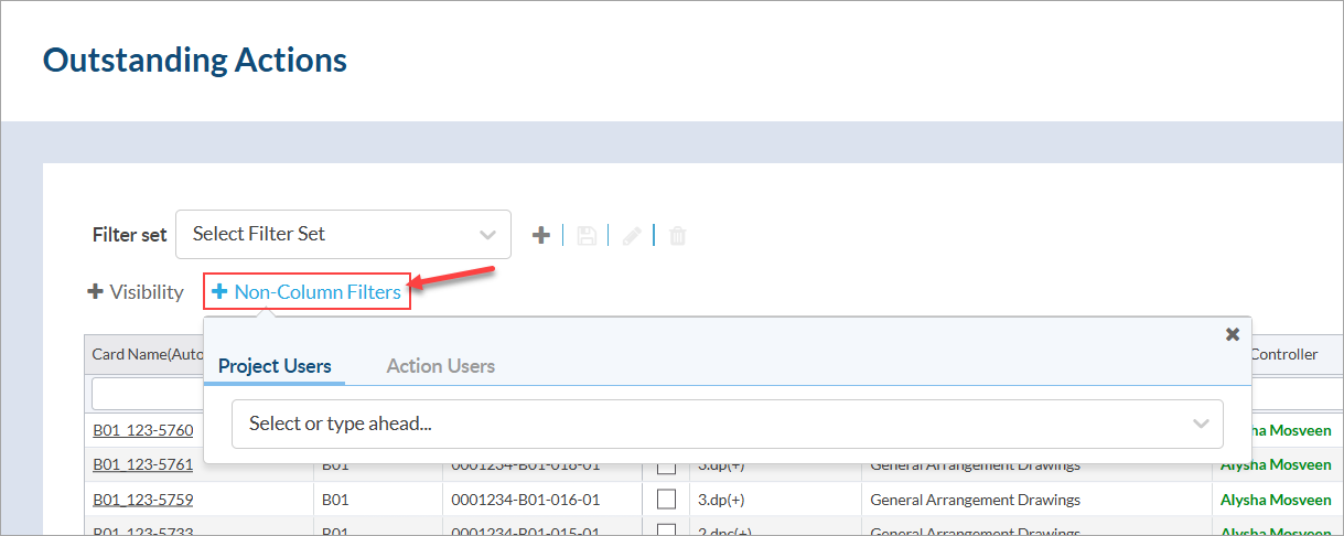 In addition, the grid can be filtered by project users and/or action users using the "Non-Column Filters" options: