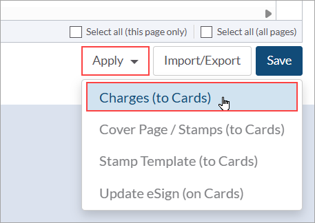 If information on the code list has been updated, also make sure to apply the updates to the cards by selecting the impacted doc code(s), expanding the "Apply" drop-down, and choosing "Charge (to Cards)"