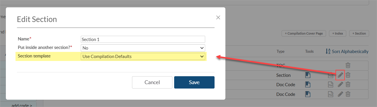 If different section title page templates are required for different sections, there is the option to set a specific section title page template per section by clicking the pencil icon under tools.