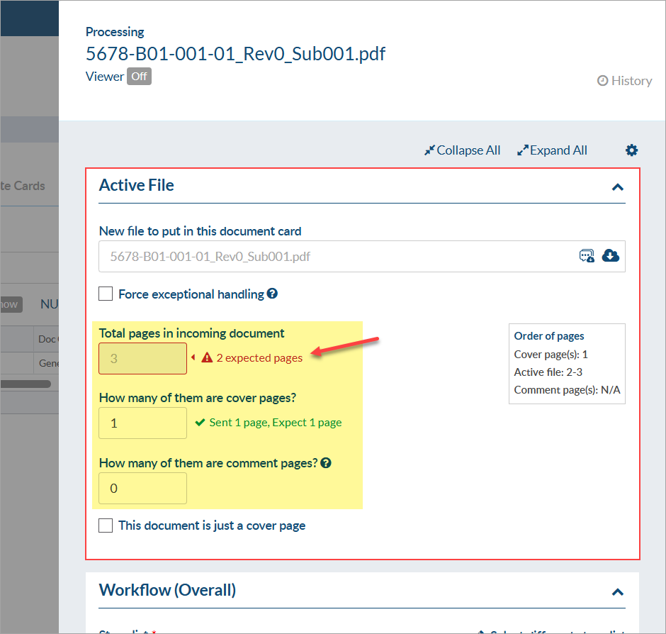 If, using the previous example, you tell the system there is 1 cover page and 0 comment sheets, it MUST mean that the document is now 2 pages, not the original 1. DocBoss has stripped the NEW cover page added by the customer (just the stamp) as the SINGLE cover page (1 page), and the remaining 2 pages (the original cover page plus the 1 page document) has been set in the system as the NEW original document. NOTE - you WILL see a warning telling you that the new document has a different page count that then original outgoing document. If you ignore it - this is accepted by the system.