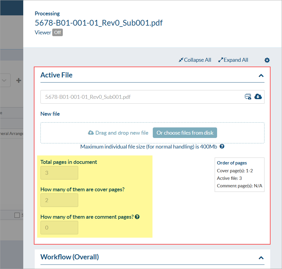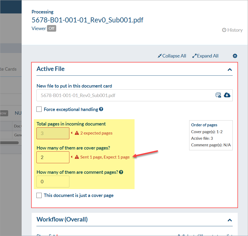 If, during the revision/approval of the document, the customer adds page e.g. they add an extra front page with a stamp (instead of adding the stamp directly on the original cover page), DocBoss will display page count errors and expect some form of resolution.