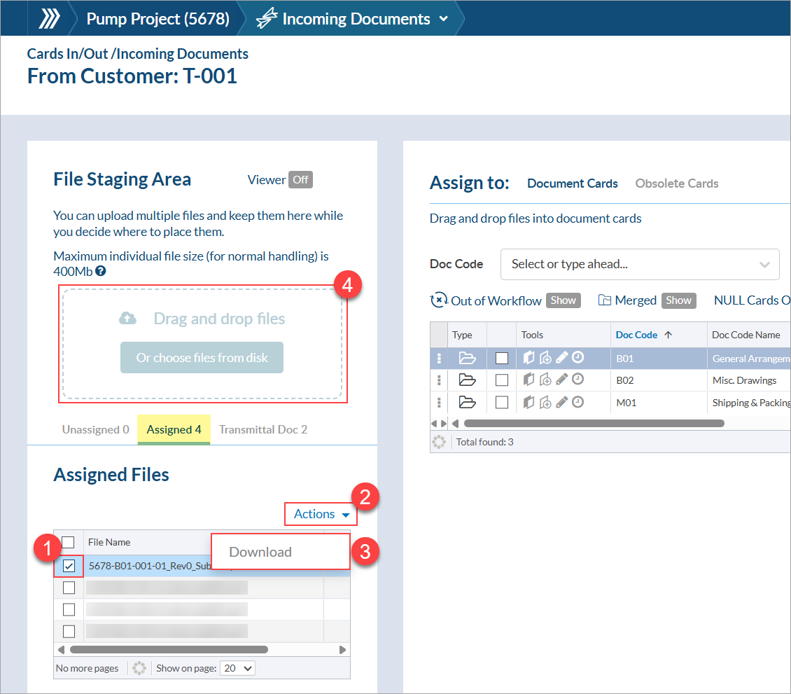 Alternatively, you can find the card in the card list and download the file from either (A) the "Document" column, or (B) by clicking the pencil icon under "Tools" and downloading from the "Active File" section. Once downloaded, you can re-upload the file as a new incoming submittal, OR you can open the original incoming submittal and re-upload the file into the "drag and drop" area. Then, adjust the page counts in the processing form before saving.
