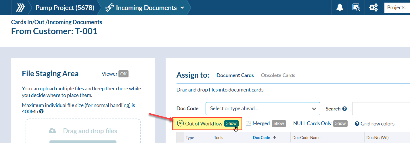 Note: The card will be hidden from the grid when you are looking to re-upload the file, as it is already be considered processed by the system. To see the card in the grid, make sure to enable the "Out of Workflow" cards by clicking the "Show" button.