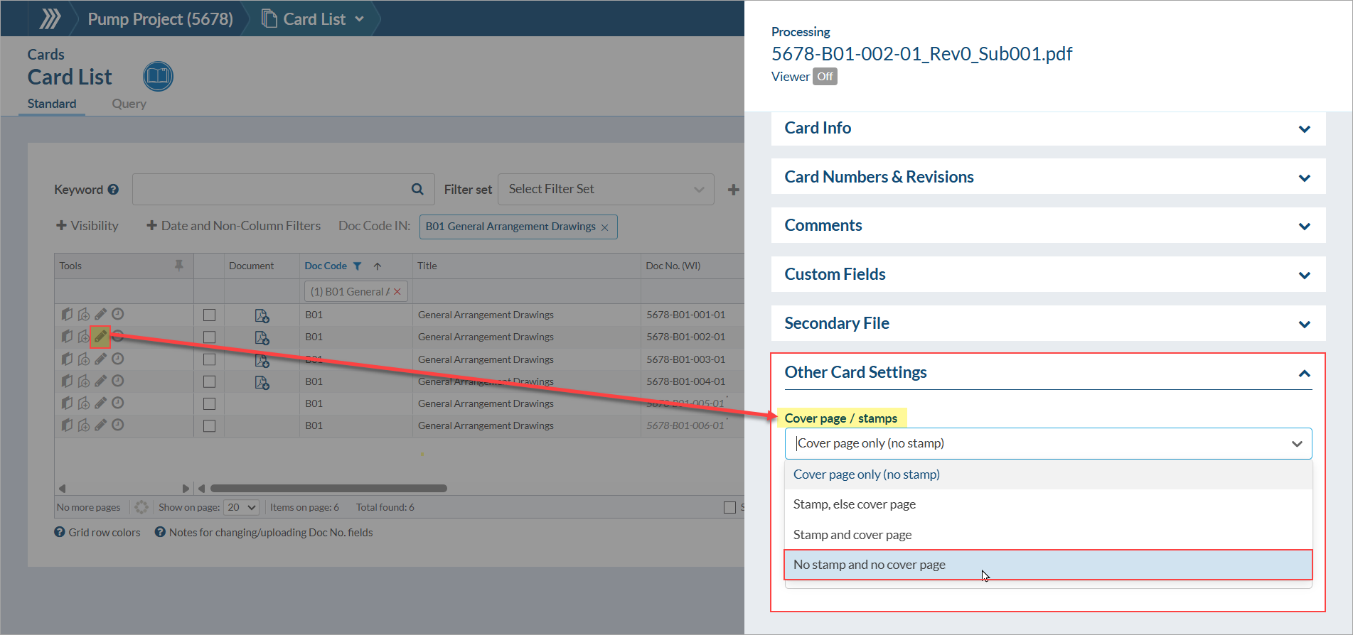 First: Change the cover page settings of the card to “No stamp and no cover page”. This tells DocBoss that we don't want to add a new cover page to this card on submittal.