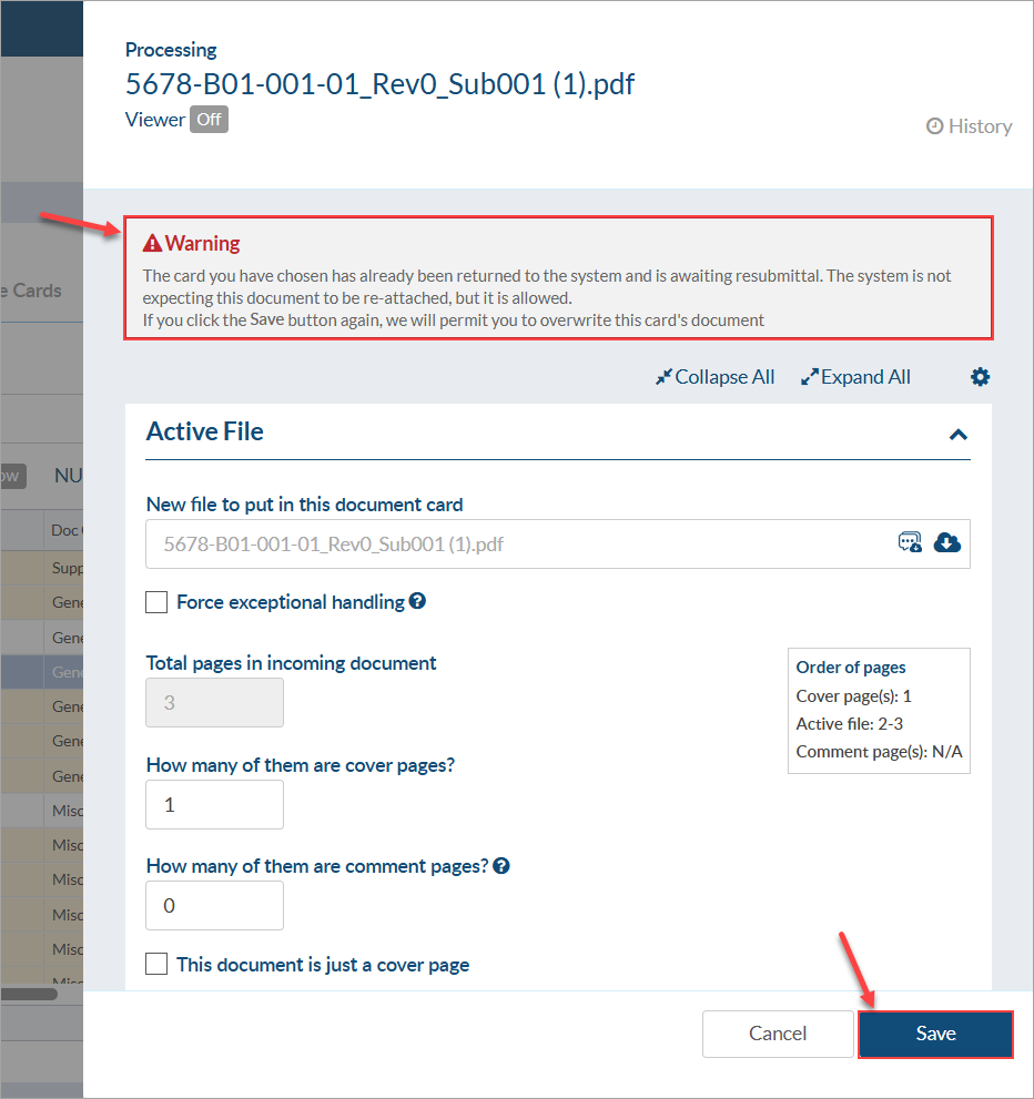Once the page counts have been adjusted and you click "Save," a warning message will appear to notify you that this card already has a file and that if you click “Save” again, the new file will overwrite the previous document (which is the desired outcome in this case).