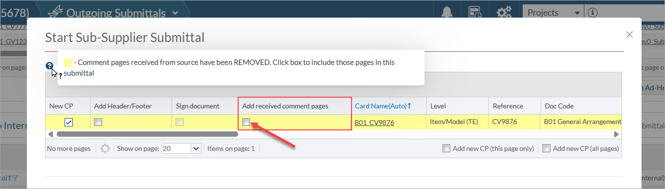 By default, comment sheets uploaded to DocBoss will not be included in the next outbound submittal. If desired, users can choose to include comment sheets using the checkbox on the outbound submittal grid (for each card).