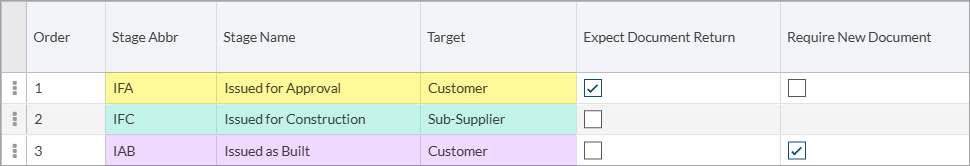 Each stage contains a stage abbreviation (e.g., IFA) and a stage name (e.g., Issued for Approval). In addition, a target (e.g., customer) is identified for each stage.