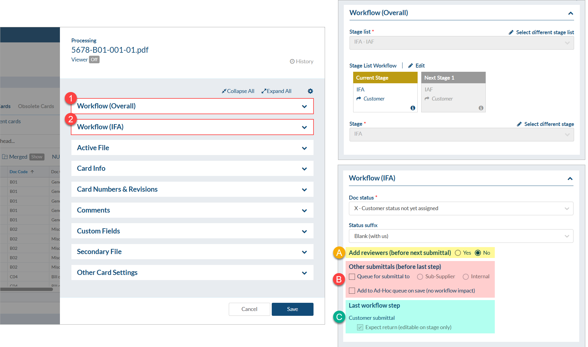 Other card information (e.g., document title, document numbers, revision number, submittal comments, etc.) can be adjusted as needed. When all the required information has been adjusted, click "Save" in the bottom right.