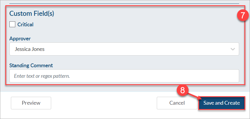 7. Fill in any custom fields (if applicable). Text fields can be entered as text or using a regular expression. Note that if the custom text field is left empty and there is a value selected on the primary doc code, the new card(s) will inherit the same custom field value.
