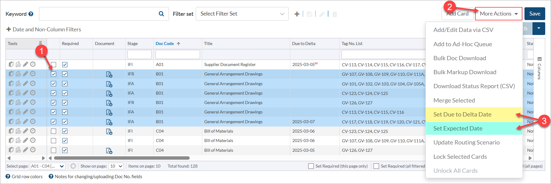 - Open the "More Actions" drop-down to choose whether you want to Set the Due dates or the Expected dates