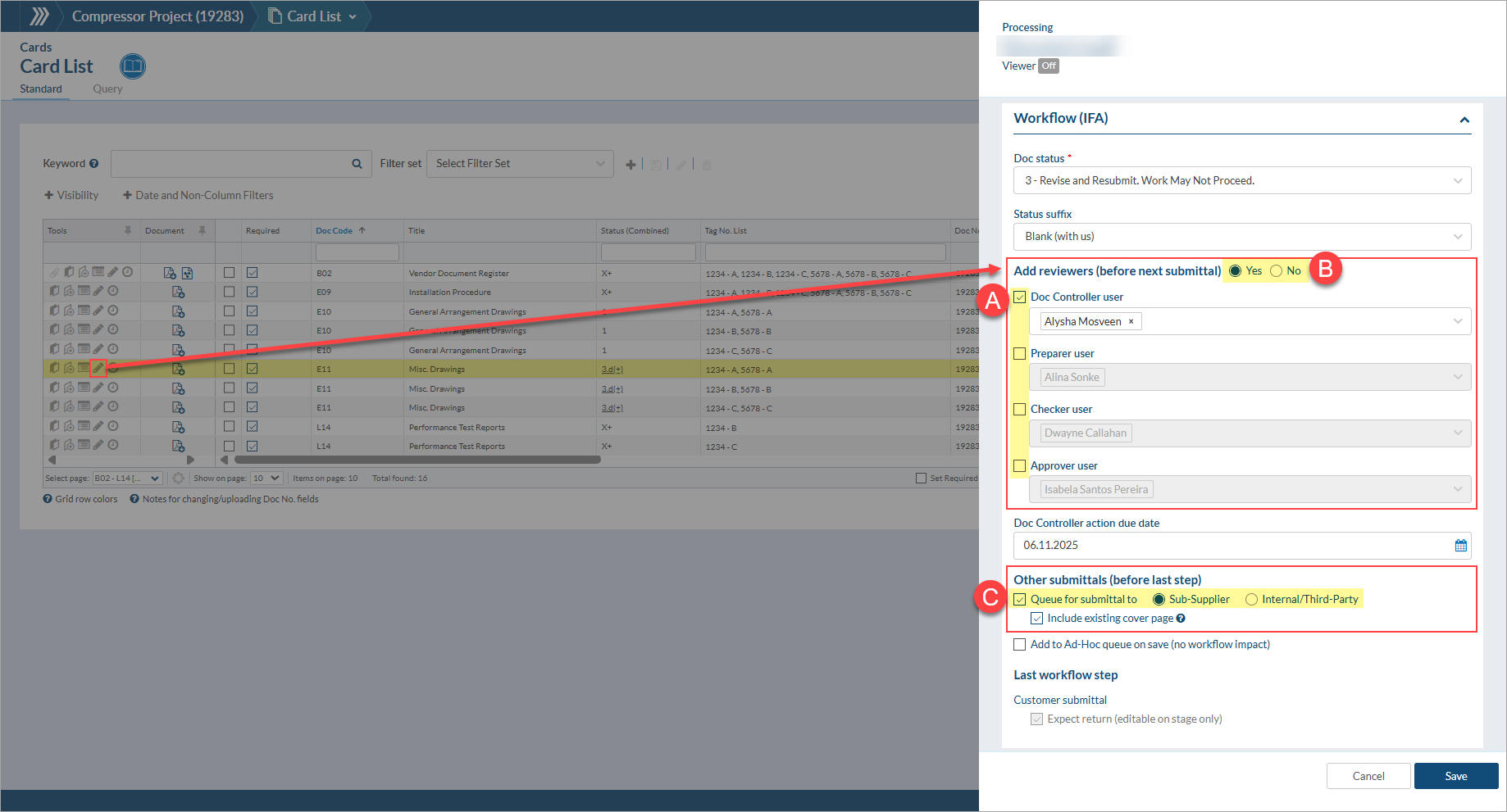 During the course of managing cards, you define routing and submittal requirements. This is typically managed by DocBoss as you upload documents to the system because you have already assigned your specific workflow instruction.