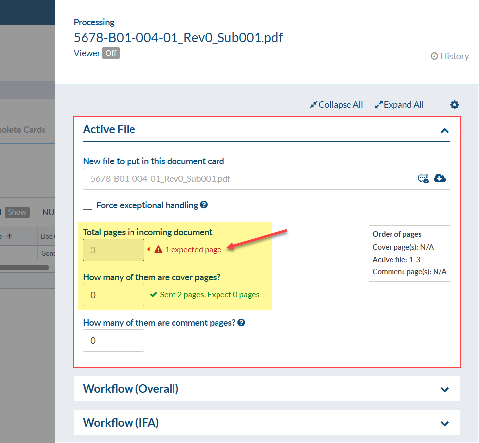 If incoming pages doesn't match, a warning message will show the expected pages in red: