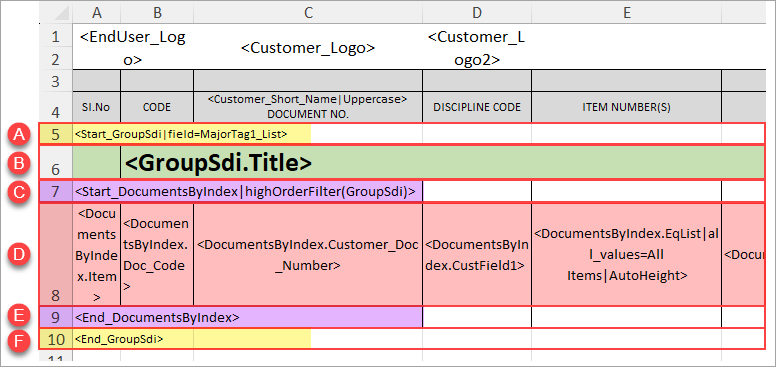 Cards included in an SDI report can easily be grouped by a specified value (either by Major Tag OR by a custom doc code/card field). To achieve this , the "GroupSDI" array can be added to the template (encompassing the "DocumentsByIndex" array).