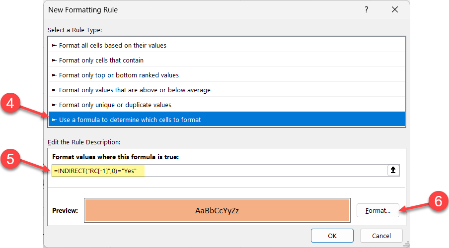 - Choose the option to set a formula for conditional formatting and enter an INDIRECT formula that looks at the cell ONE column to the left (i.e., -1) to determine whether or not it should receive conditional formatting (i.e., if the value in the "Conditional Formatting" column is "Yes"). Then, set the desired formatting using the "Format..." selector (e.g., setting the cell to fill in orange).