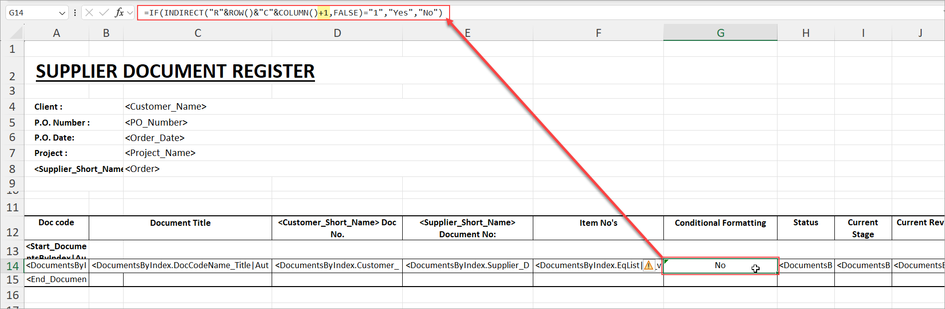 - Add a new column to the left of the "Status" column and enter an INDIRECT formula that looks at the cell ONE column to the right (i.e., +1) to determine whether or not the value is "1". If the cell equals "1", it will populate "Yes," and if it has any other value, it will populate "No."