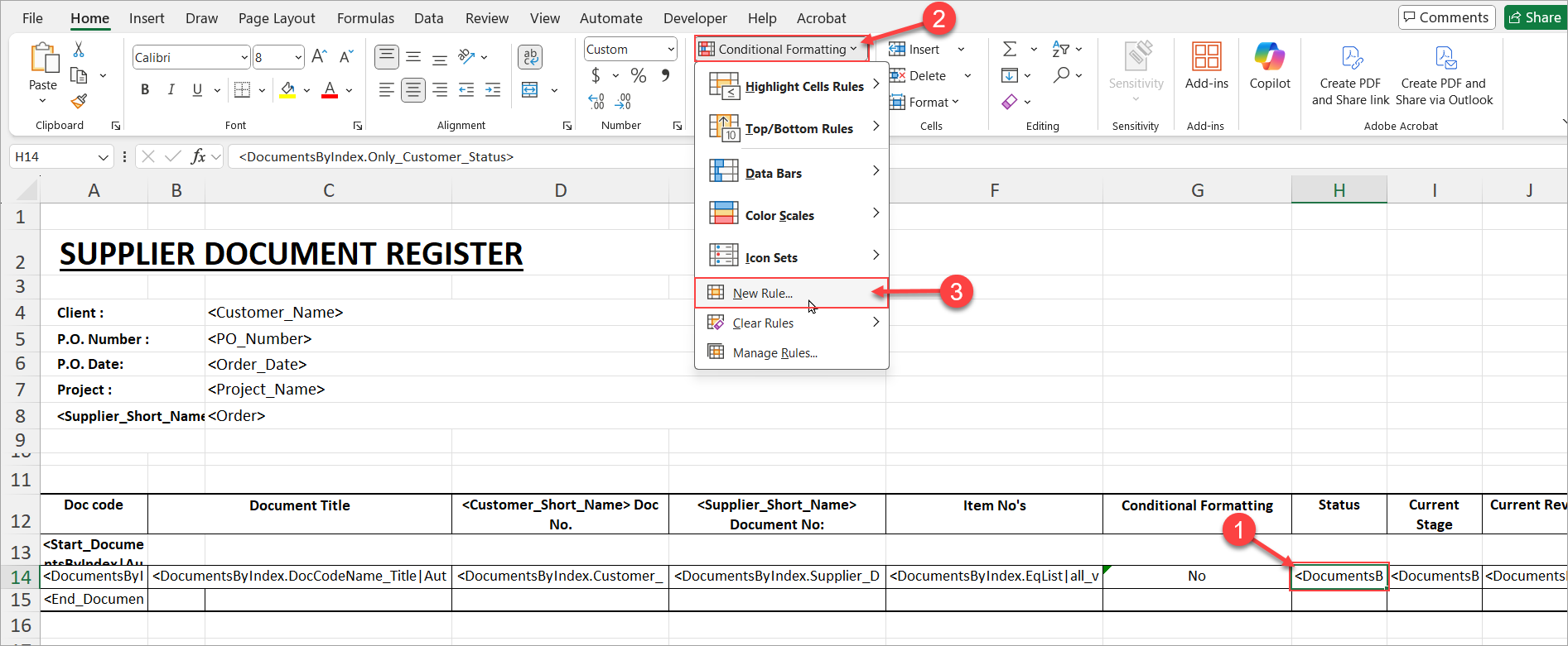- Select the "Status" column, open the "Conditional Formatting" options, and click to create a new rule.