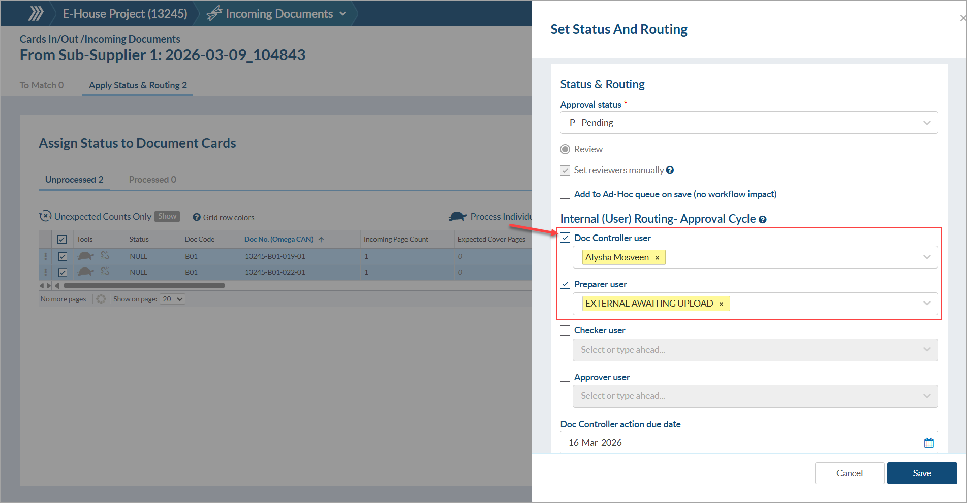 - Option 2: If assigning files in bulk, set the internal routing to you (doc controller) and to the placeholder user created previously (preparer) all at once.