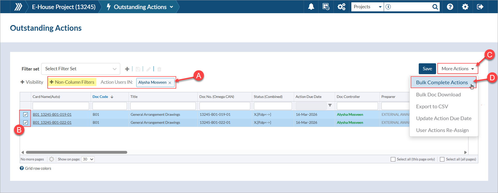 After assignment, navigate to Project Menu > Outstanding Actions and filter the grid to see the actions assigned to you (doc controller). Select the appropriate files from the grid, click "More Actions," and choose "Bulk Doc Download" to download the file assigned to each card.