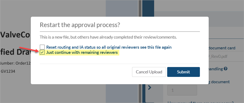 - Option 1: If assigning files individually, you will receive a pop-up indicating that internal approval is in progress. To move forward, check the option to "Just continue with remaining reviewers" and manually remove the routing to the placeholder user. Once a status is assigned and the card is processed, the workflow will continue as defined by the stage settings (e.g., confirm to source, continue stage after IA).