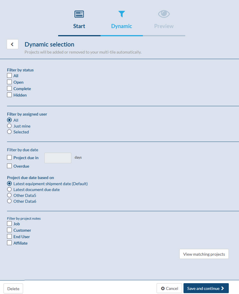 2. Enter a name for the tile and select whether to add projects by dynamic (define a query) or static (pick specific projects) or both.