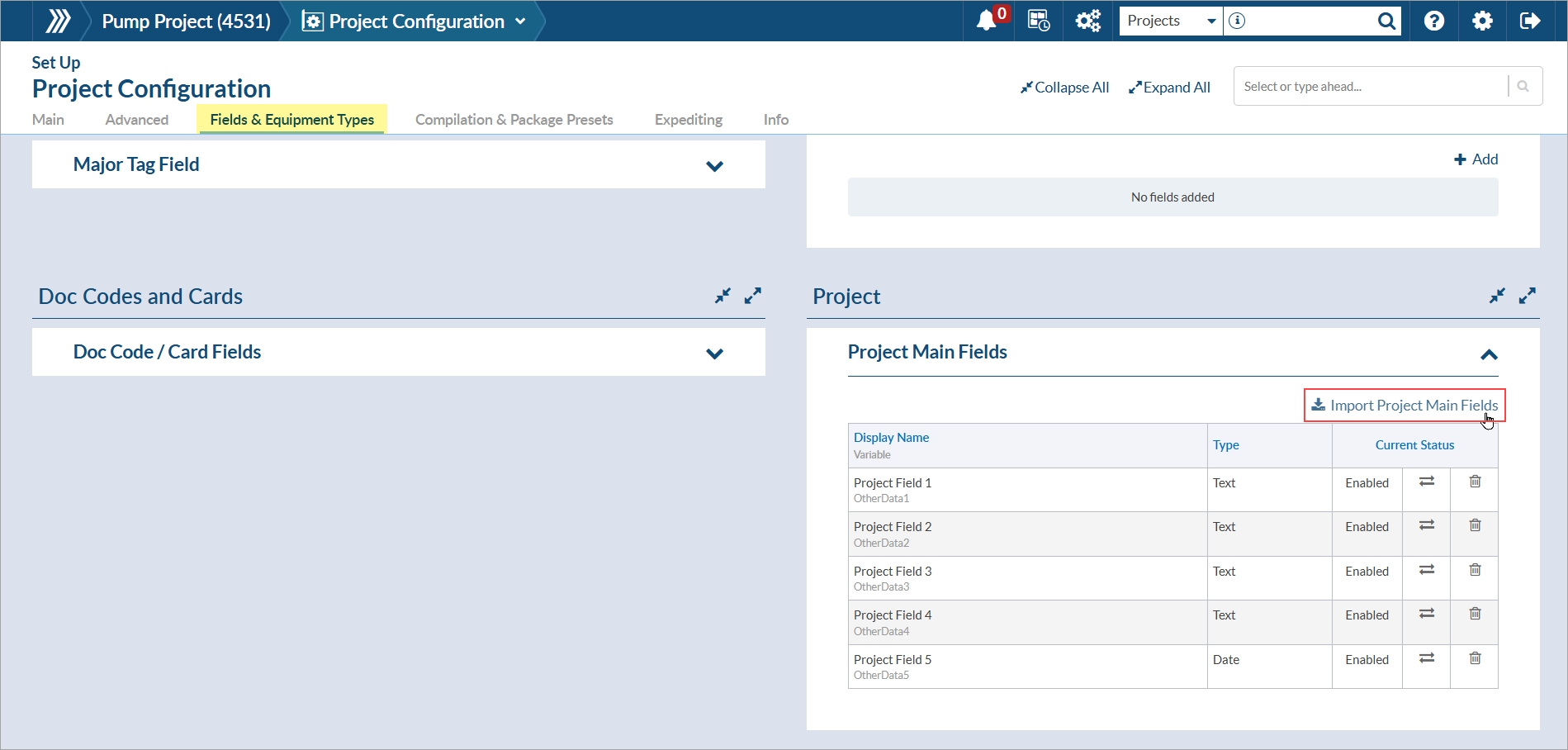 Once a custom project (main) field has been created, you must import it into the project from the Project Configuration page. To do this, navigate to Project Menu > Set Up > Project Configuration. Open the "Fields & Equipment Types" tab and expand the "Project Main Fields" section. Click the "Import Project Main Fields" option, choose the field(s) to import, and click "Add." Once imported, the field(s) will automatically be enabled.