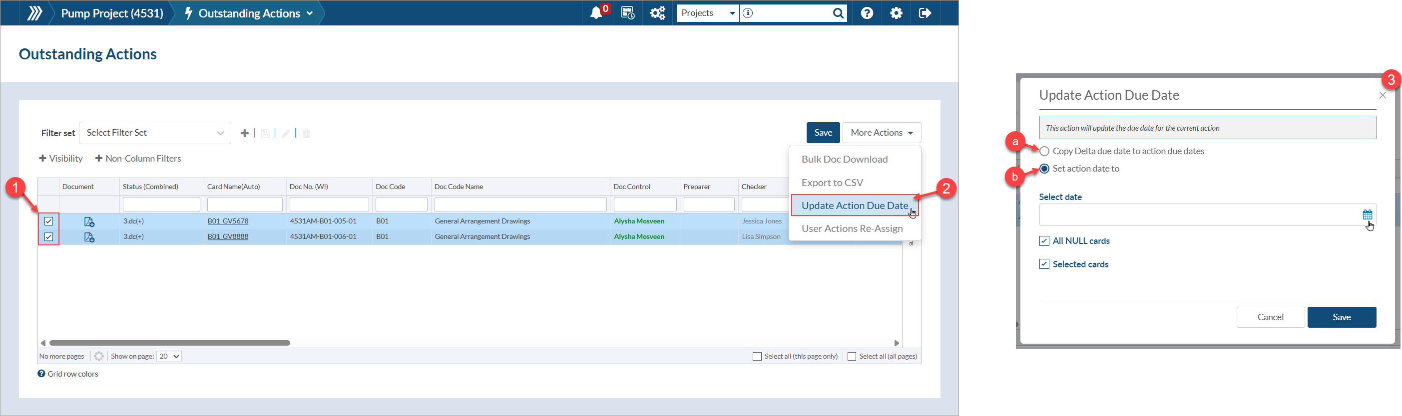 Action due date (bulk editing): Previously only available for NULL cards, action due dates can now be updated for ALL cards. After selecting the cards from the grid, there is the option to either (a) use the same date as the due to customer date, or (b) select a specific date.