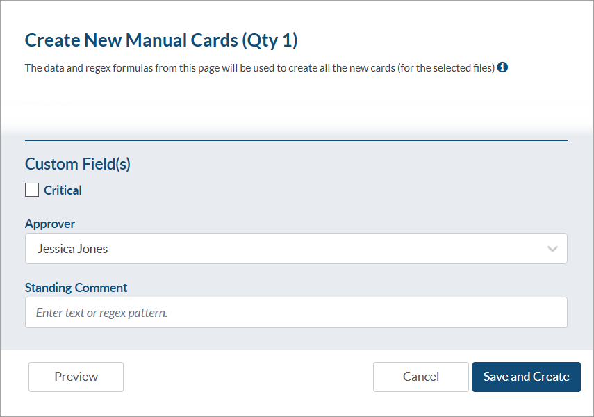 Custom field data using create cards and match: When creating new manual cards using the "Create cards and match" option, data can now be filled into custom fields, removing the need add this data to the card list later. If entering a value into a text field, either text OR a regular expression (regex) pattern can be used.