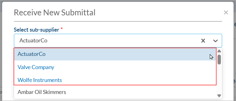 Quick select "active" sub-suppliers: When creating a new incoming sub-supplier submittal, the sub-suppliers that are the most likely to be selected are now displayed at the top of the list (in alphabetical order) and are displayed in blue text, making sub-supplier selection more efficient.