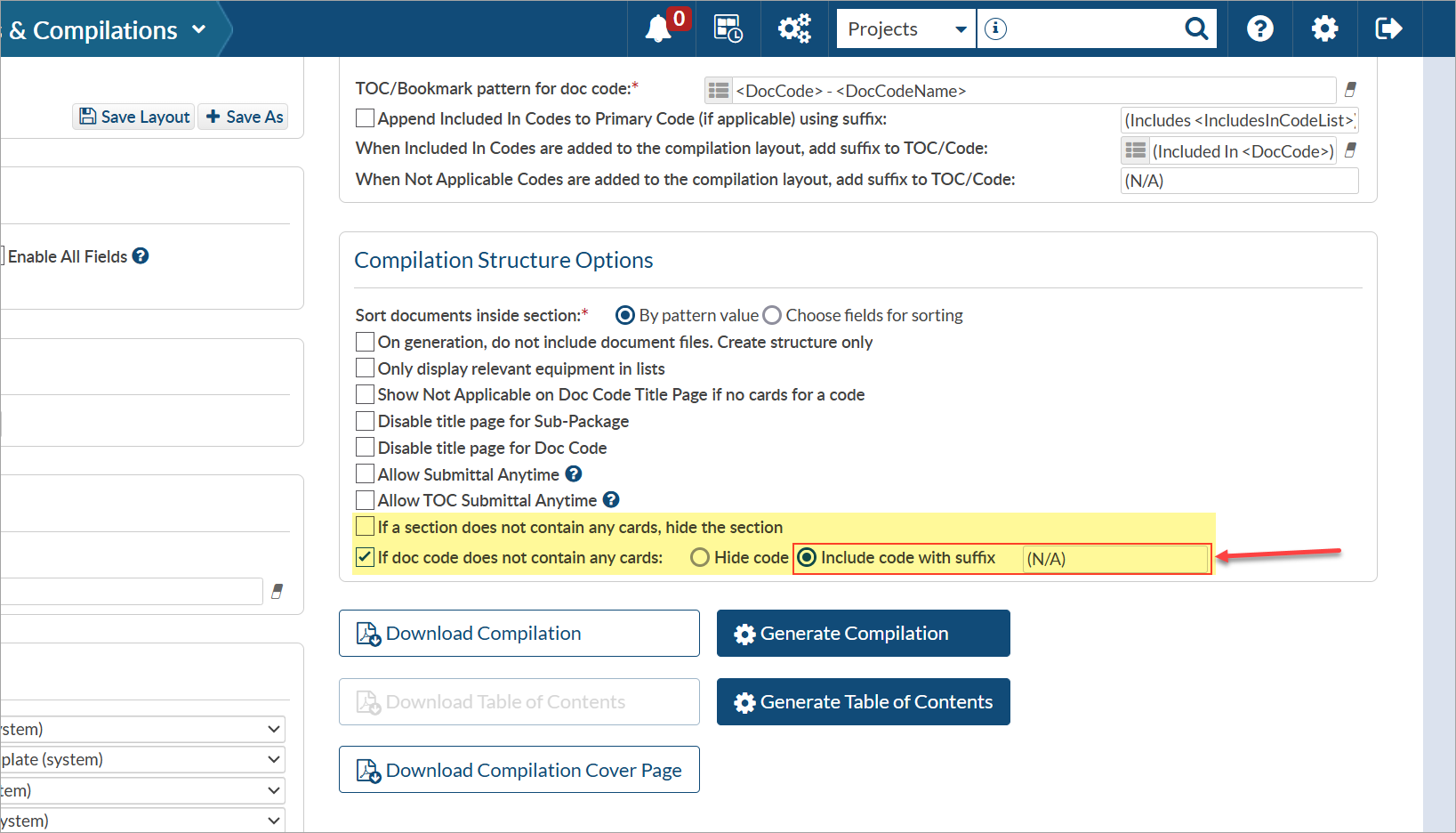 Include suffix for when no cards exist for an included doc code: If you need to indicate when no cards are included for a doc code in the compilation structure, a custom suffix can now be added from the "Compilation Structure Options" area. If instead doc codes should be hidden when they do not contain cards (OR entire sections should be hidden when no cards exist), these options are also available.