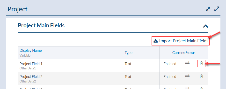 Add/delete project main fields: Custom project main fields can now be removed from the the project configuration page (and/or project configuration templates) when they are not needed. If a new custom project main field should be added into the project/template, it can be brought in from admin using the "Import" button.