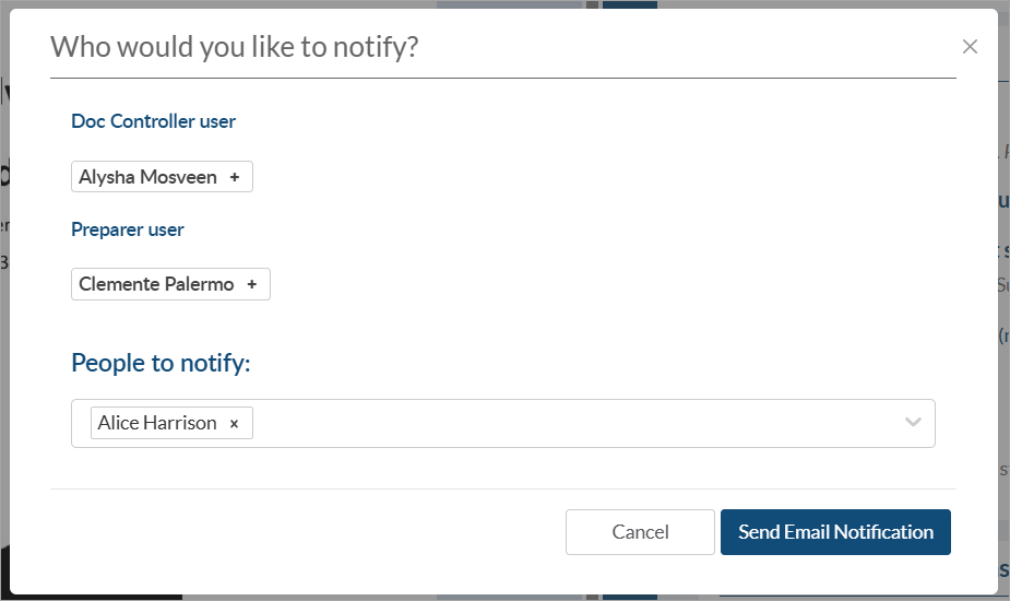 You will also have the option to notify the user(s) whose action was removed and/or any users you specify - by default, the doc controller on the project will be included on the notification list.