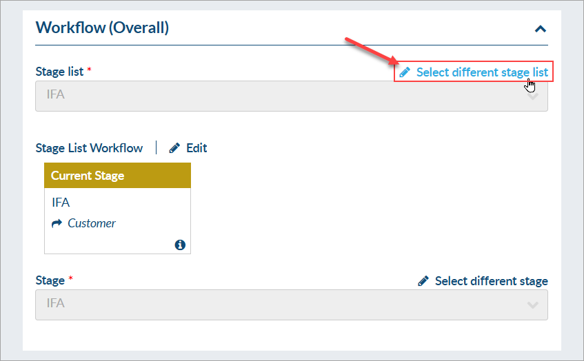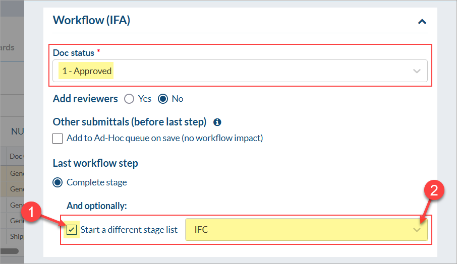 Once all three stage lists are created, set the stage list on the doc code to the first stage in the workflow. In this case, set the stage list to "IFA."