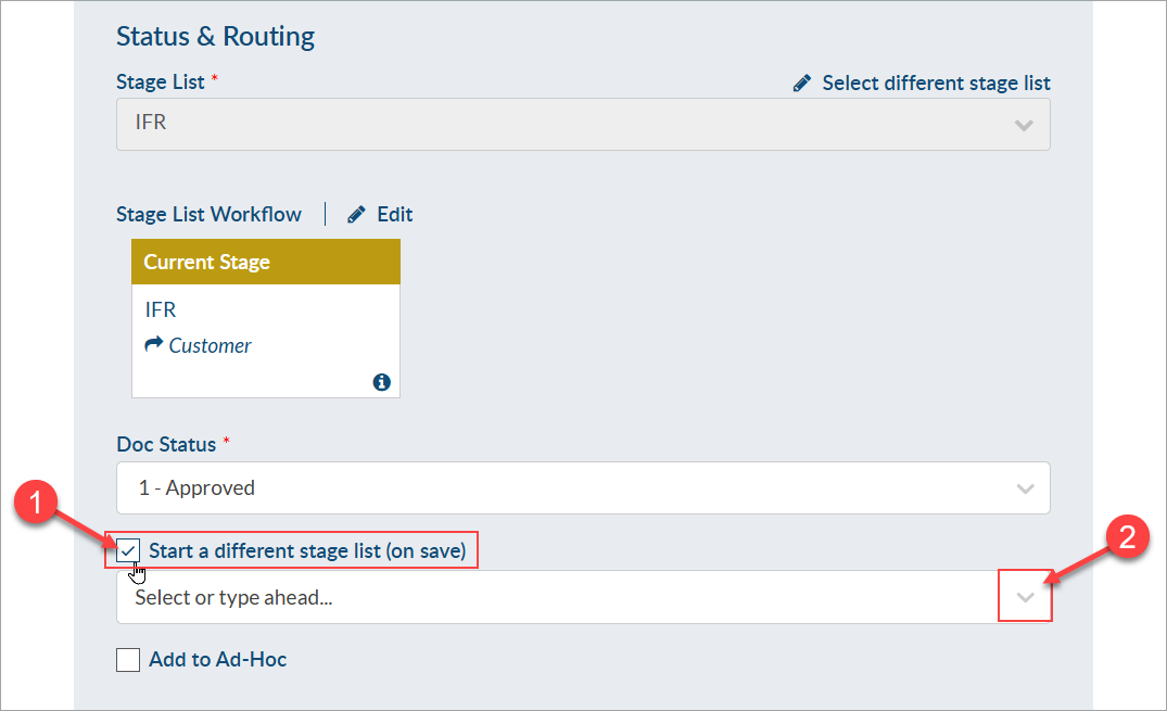 Sometimes, the full workflow required for a document is unknown OR the workflow takes a different path than what was set up initially. In cases like this, a different stage list can be selected after completion of the current stage.