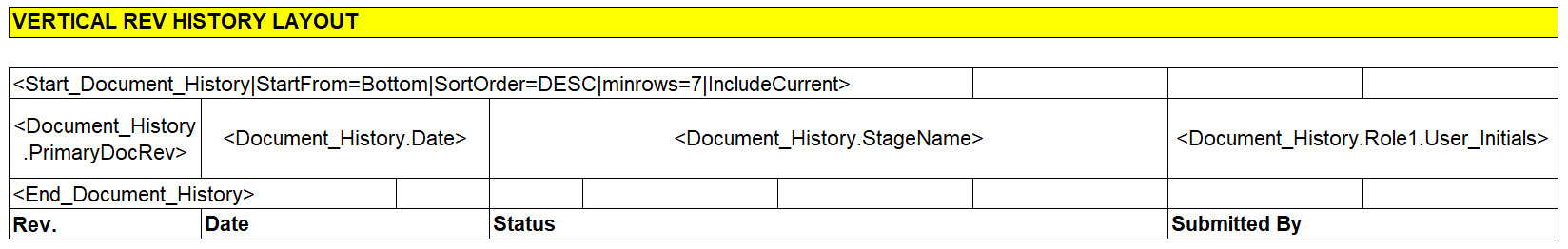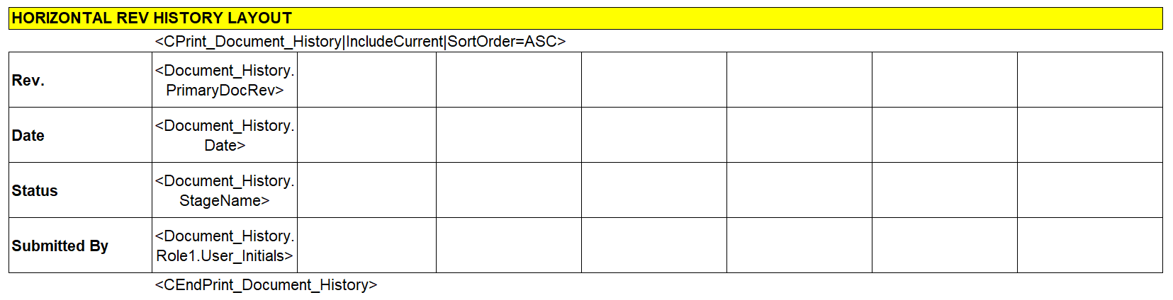 If the revision table should be displayed in a horizontal format, follow the same three row structure but instead using <CPrint_Document_History> to start the array, and <CEndPrint_Document_History> to end the array. Inside the array, use the Document_History variables as usual.