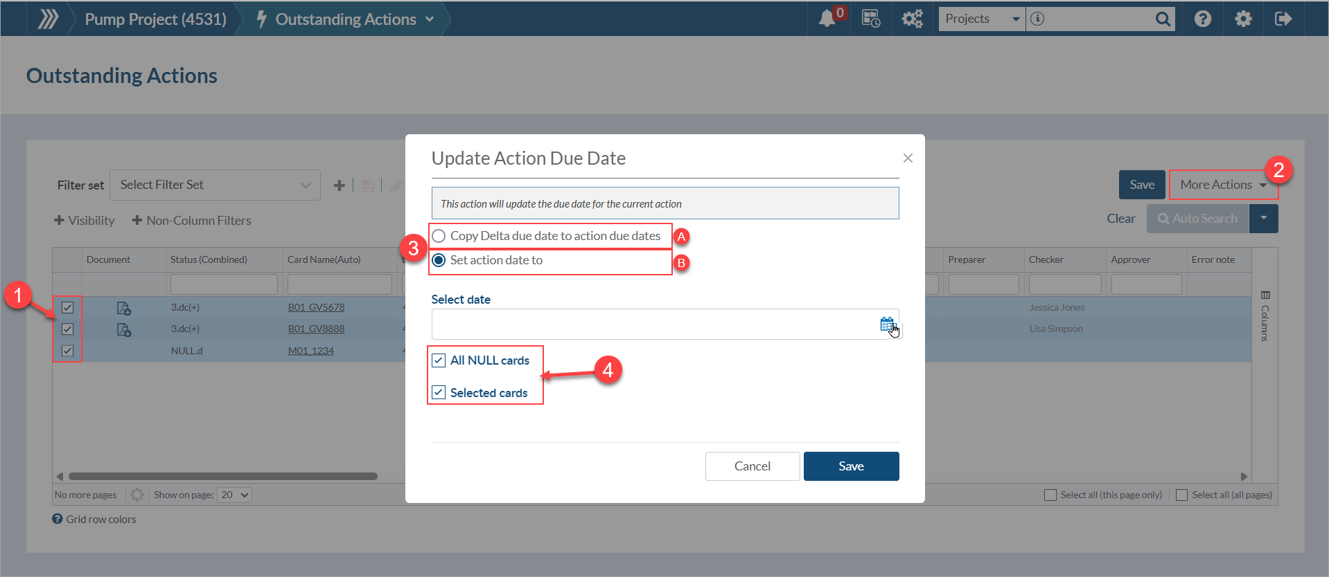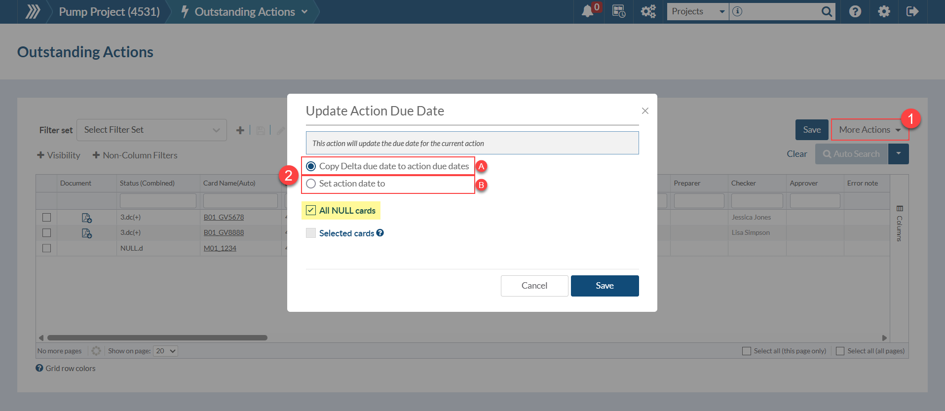 If the action due dates of multiple cards (with different statuses) should be updated, this can be done in bulk, too. To do this, first select the cards that require updating. Once selected, expand the "More Actions" drop-down and select the option to "Update Action Due Date." A pop-up will appear where you can choose to either (A) set the action due date to match the customer due date, or (B) select a specific date (via calendar selector). By default, both selected cards and NULL cards will have their due dates adjusted after saving, but the NULL cards option can be de-selected if desired.