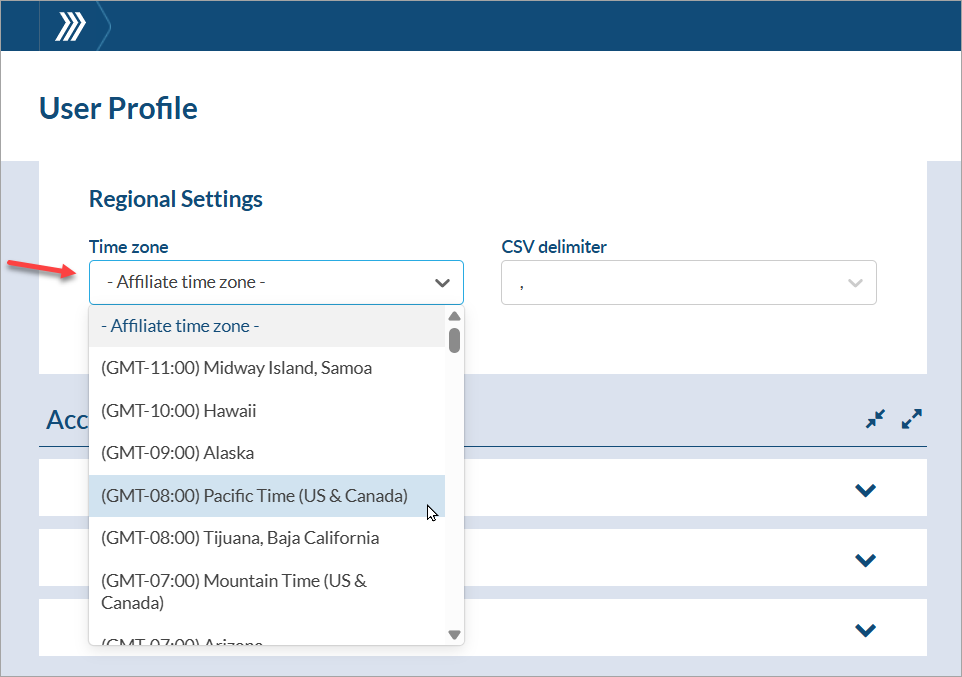 By default, the user's selected time zone will match the time zone set at Admin > General (i.e., instance time zone). If using custom affiliate admin settings, the user's selected time zone will default to the time zone set for their primary affiliate. In either case, the user's selected time zone can be adjusted if desired.