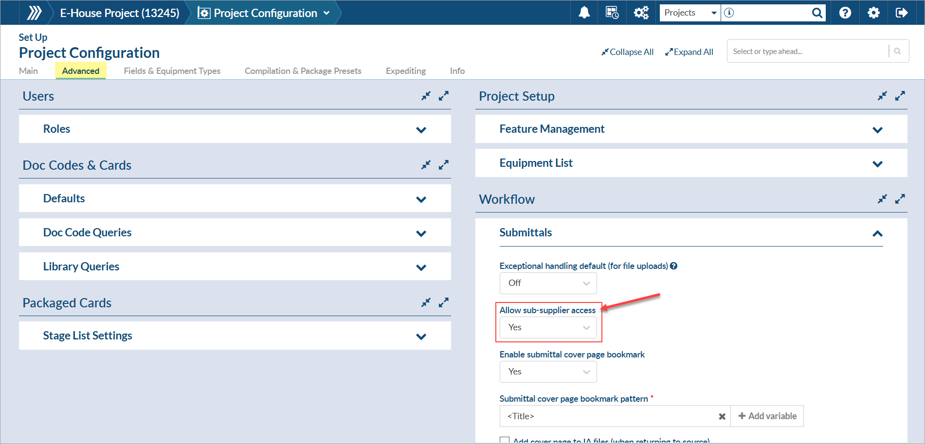- To confirm that the portal has been enabled on the project, navigate to Project Menu > Set Up > Project Configuration > Advanced and confirm that the "Allow sub-supplier access" option is set to "Yes."