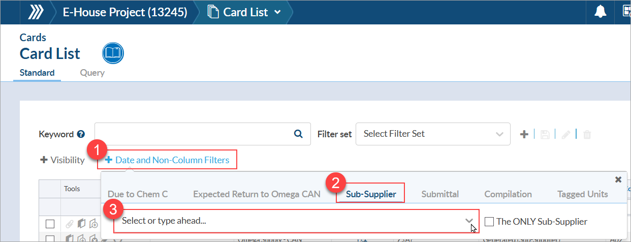 - To confirm that the supplier is associated with at least one card, navigate to Project Menu > Cards > Card List, open the "Date and Non-Column Filters" options, navigate to the "Sub-Supplier" tab, and filter by the applicable supplier.